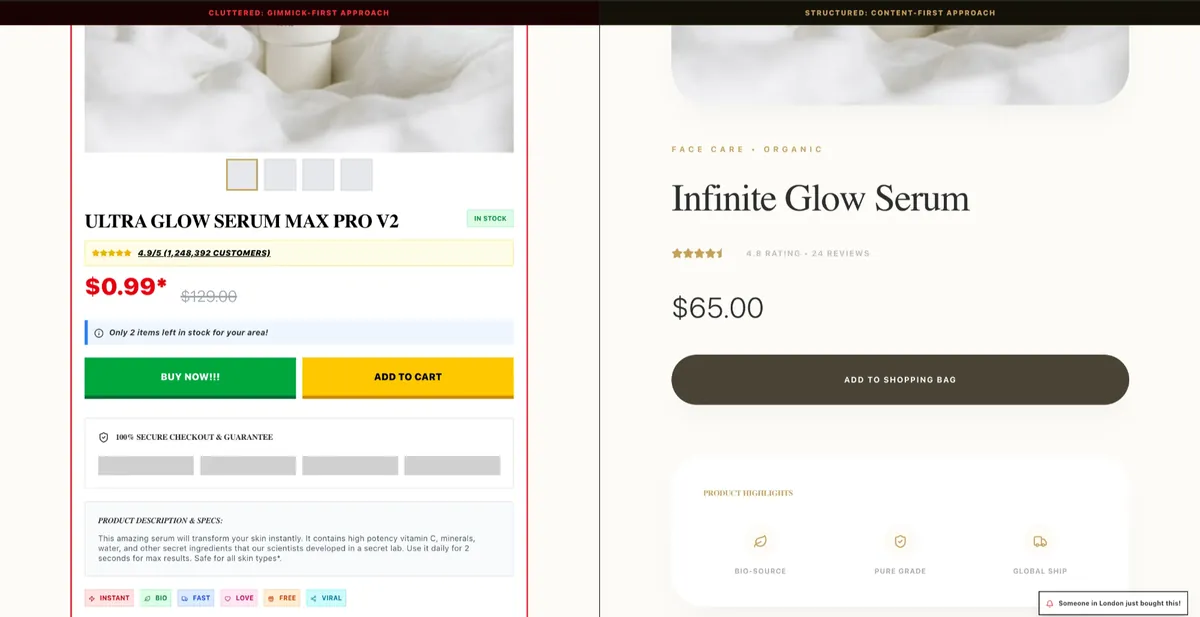 I've seen too many e-commerce sites that prioritize visual gimmicks over clear information. Parallax scrolling, autoplaying videos, complex animations. All that stuff that makes page speed crawl and frustrates users trying to find basic product information.